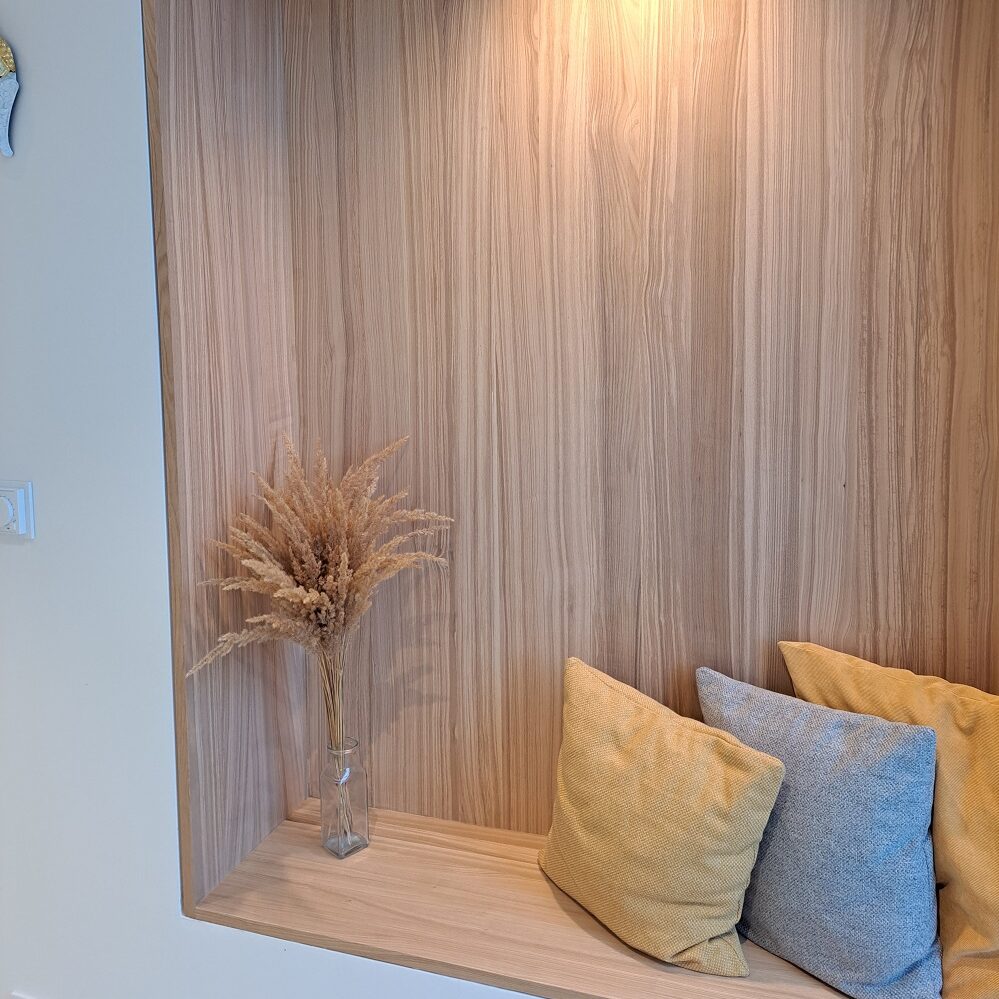 Sestava je z klasického bílého matného lamina v kombinaci s dřevodekorem krásně dotváří celkový design domu.