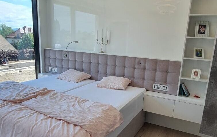 Nadčasové vybavení ložnice v odstínu bílého matného lamina, které doplňuje obklad ze skla na zdi a jemně fialové čalouněné čelo postele. Tato elegantní ložnice se nachází v rodinném domě v Liberci. Součástí vybavení je i kosmetický stolek, rovněž z bílého matného lamina. Všechny zásuvky jsou bez úchytek a otevírají se speciálním bezúchytkovým systémem.